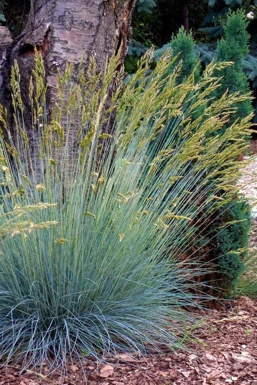 Not to be confused with the green fescue grass that is used for a lawn and requires frequent mowing, Blue Fescue is a low maintenance clumping perennial grass popular for adding cool color and soft texture in the garden. The powder-blue foliage of Blue Fescue stays bright through all seasons for year-round interest. The flowers that rise above the tidy mounds in late spring and summer add even more interest to this wonderful ornamental grass. Flowers start out greenish-blue and fade to a straw-yellow color by late summer. If you’d rather not have the flowers they can be removed without harming the plant.